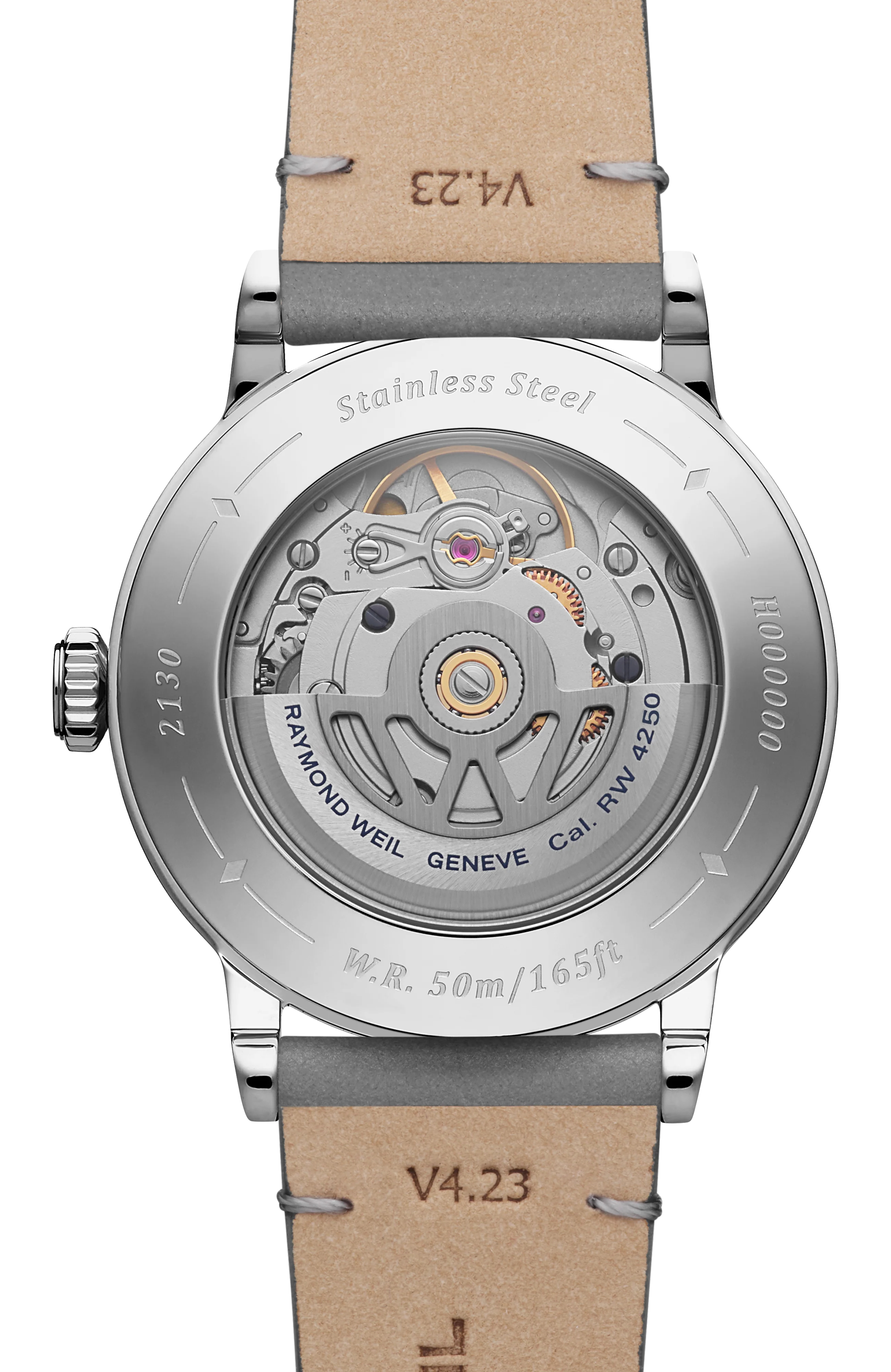 A sapphire caseback affords sight of the self-winding movement within and the “W-shaped” oscillating weight, RAYMOND WEIL’s horological signature. The grey genuine calf leather strap is enhanced with a unique W-stitched detail.