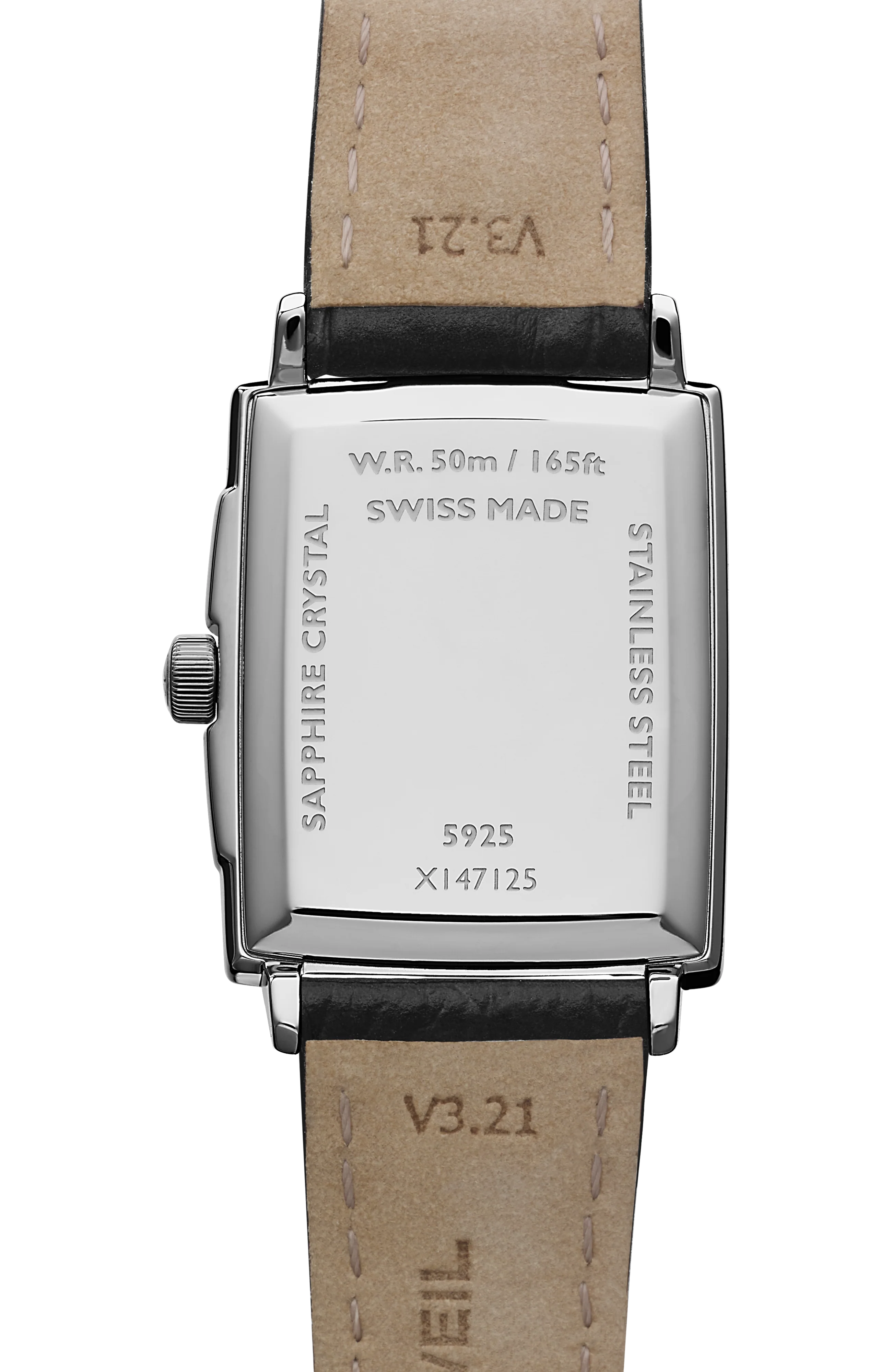The sapphire crystal window is framed by a beveled rectangular case. The tiered design gives this watch an illusion of depth without the thickness. The watch is completed with RW logo signature upon the crown.